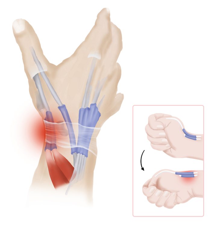 דלקת של הגידים המצויים בשורש כף היד, בבסיס האגודל. גידים אלה אמונים על תנועות ההרמה וההטיה של האגודל. לרוב, התסמונת תתבטא בכאבים בשורש כף היד. הטיפול הראשוני יהיה שמרני ויכלול זריקות קורטיזון ושימוש בסד. במצבים בהם הטיפול השמרני לא הועיל למיתון הכאב יישקל ניתוח.